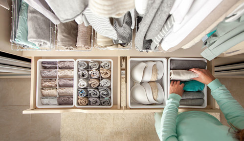 Kies voor verstelbare planken of wissel je kleding per seizoen af. Zo hou je meer ruimte over in je inloopkast. En maakt het eigenlijk niet uit hoeveel spullen je hebt. Daarnaast kun je ook handige opbergzakjes aan de deur hangen om kleine items in op te bergen zoals schoenen, sjaals of sieraden.