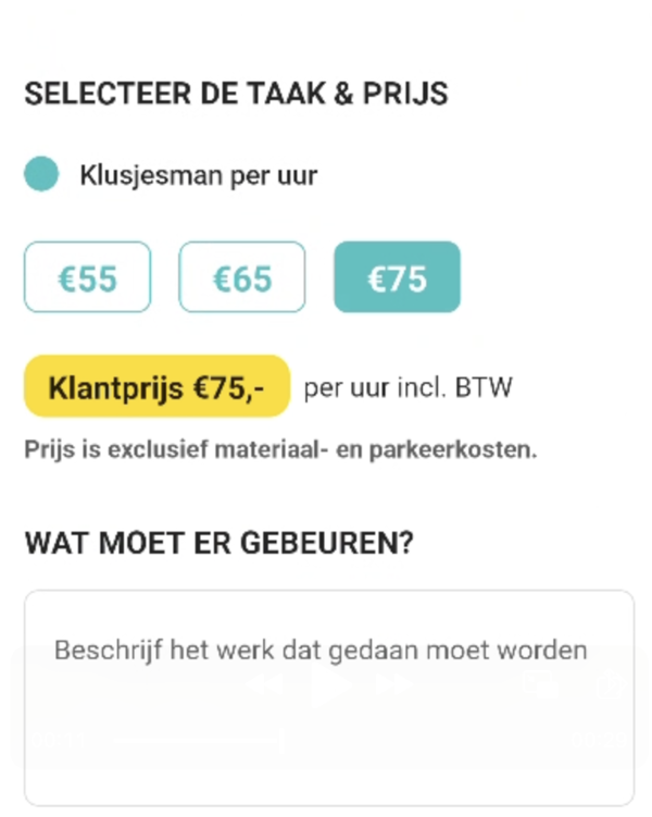 De klantprijs is gebaseerd op onze vaste uurprijs. Is de klus groot, dan kan je voor een iets lagere prijs kiezen. Is het een kleine en complexe klus, dan kan je een hogere klantprijs selecteren in afstemming met de klant. Wij verwachten dat jij de klantprijs goed kan inschatten.