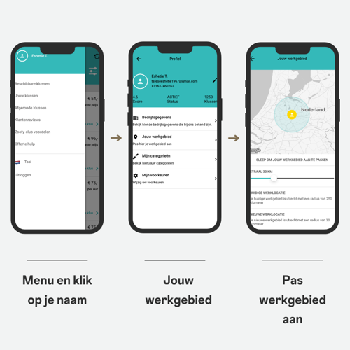 Hier kun je verschillende onderdelen van de app openen en ook je werkgebied aanpassen. Door op je naam te klikken open je je profiel en kun je instellen in welke regio je wilt werken.