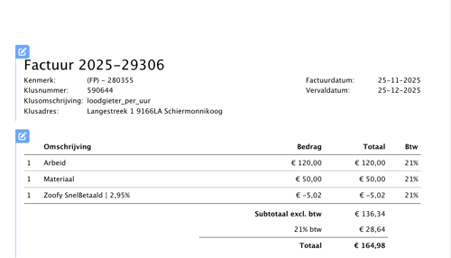 Als vakman bepaal je zelf op welke klussen je de Zoofy SnelBetaald service wil activeren. De service is goed ingeschakeld als je op je inkoopfactuur het Zoofy SnelBetaald kenmerk ziet. Zie het voorbeeld.
